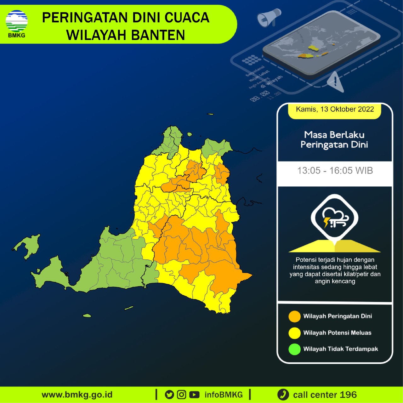 JABARBANTEN.id | Banten – Diperkirakan pada pukul 12:35 WIB, wilayah Proovinsi Banten masih terjadi Hujan Sedang-Lebat yang dapat disertai Kilat/Petir dan Angin Kencang pada pkl. 13:05 WIB.