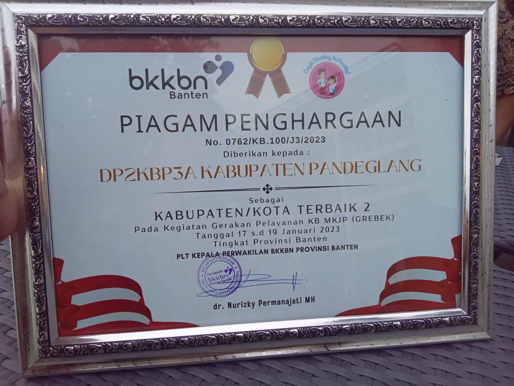 JABARBANTEN.id | PANDEGLANG – Dinas Pengendalian Penduduk Keluarga Berencana Pemberdayaan Perempuan dan Perlindungan Anak (DP2KBP3A) Kabupaten Pandeglang meraih penghargaan Kegiatan Gerakan Pelayanan KB MKJP (Gerebek) Kabupaten/Kota dengan meraih terbaik ke 2 tingkat provinsi Banten dari perwakilan Badan Kependudukan dan Keluarga Berencana Nasional (BKKBN) Provinsi Banten.