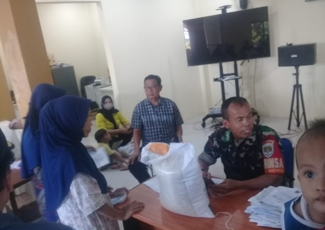 Kegiatan Penyaluran Bantuan beras Bulog madium 10kg dari Kementerian Badan Pangan Nasional bekerjasama dengan kodam dan di teruskan ke koramil setempat dan di bagikan pada KPM masing masing desa dan kelurahan oleh babinsa yang di bantu tim koramil setempat dan kepala desa atau lurah.