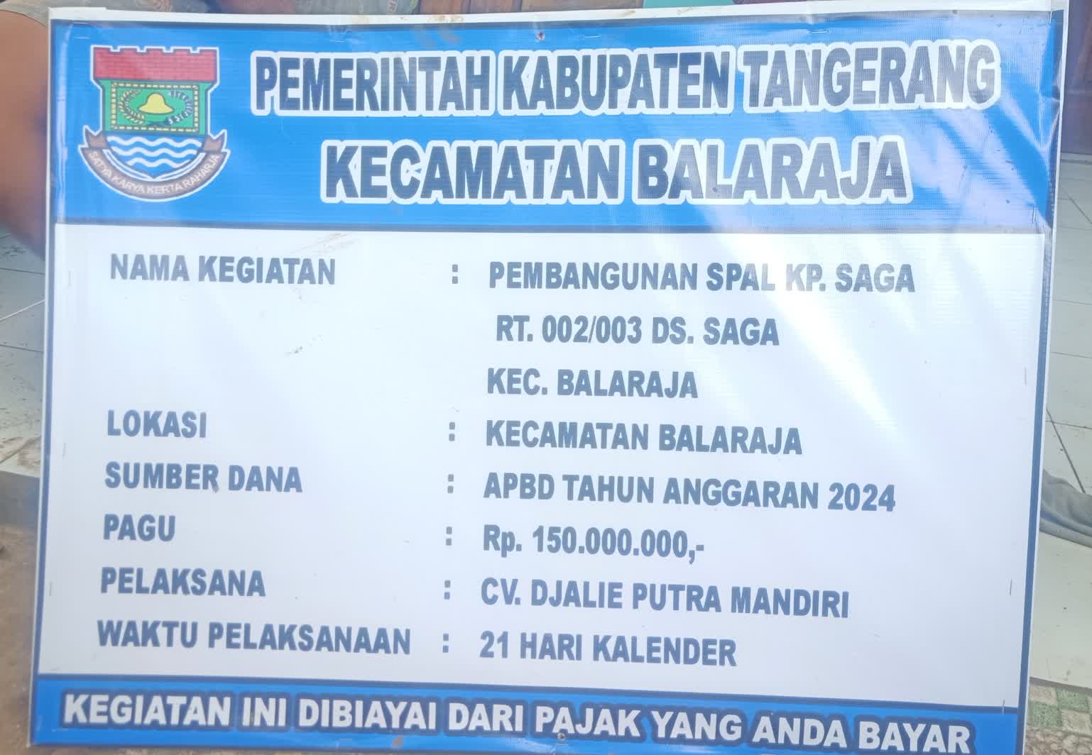 JabarBanten.id-Kabupaten Tangerang – Di Kampung Saga RT 002/003, Desa Saga, Kecamatan Balaraja, Kabupaten Tangerang, proyek yang seharusnya menjadi jawaban atas kebutuhan infrastruktur justru berubah menjadi sorotan tajam publik. Dengan anggaran Rp 150 juta dari APBD 2024, papan informasi proyek mencantumkan pembangunan Saluran Pembuangan Air Limbah (SPAL). Namun, di lapangan, yang dilakukan adalah pemasangan Uditch. Perbedaan yang tampak sederhana ini sebenarnya menjadi bukti awal dari sederet kejanggalan serius. Minggu, 08/12/2024.
